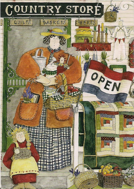 'C' is for 'Country Store'. This is a pretty art card! The store is open and sells quilts, baskets, herbs!